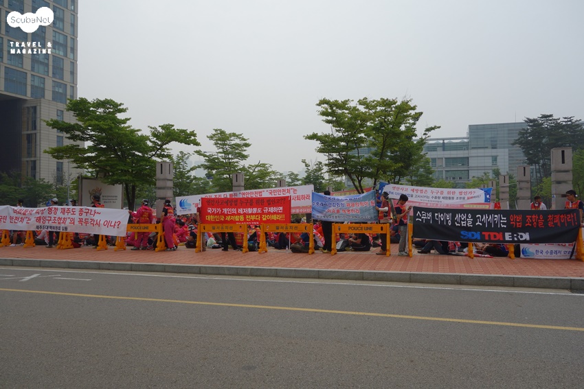 이에 한국수중레저연합회에서는 수중레저산업계의 확고한 반대의지를 표명하고자 6월 7일 해양경비안전본부가 있는 인천 송도에서 전국의 다이버들이 상경하는 궐기대회를 개최하기로 했다. 마침 이날은 송도컨벤시아에서 해양안전장비전시회가 열리는 날이었고, 국가안전처 장관의 참가가 예정되어 있었기에 해양경비안전본부에서 송도컨벤시아까지 시가 행진을 벌여서 해양안전장비전시회 앞에서 2차 집회도 열기로 한 것이었다.