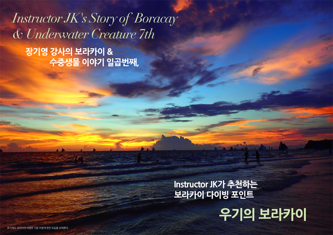우기에 만난 뜻밖의 멋진 석양을 뒤로 하고 야간 다이빙 입수를 준비하는 다이버들보라카이의 경우 우기에만 부는 계절풍-HABAGAT의 영향으로 다이빙은 앞바다 WHITE BEACH에서 진행되는 날이 적으며, 주로 뒷바다 BULABOG에서 진행됩니다. 우기 시즌 5개월, 150여일동안 앞바다에서 30일에서 40일정도 다이빙이 진행되고 나머지는 뒷바다에서 진행된다고 생각하시면 될 듯 합니다. 우기라고 해서 무조건 뒷바다라는 공식이 성립하는 건 아니고 HABAGAT이 약해지고 파도가 잔잔한 날이면 앞바다에서 다이빙을 진행하게 됩니다. 다이버들이 보라카이를 방문한 시점에 따라서 앞바다와 뒷바다 둘 다 경험할 수 있는 경우도 있습니다. 그 날의 날씨에 따라서 앞바다 혹은 뒷바다에서 다이빙이 진행될지 결정되기 때문에 보라카이 전체를 경험할 수 있는 것이 우기의 장점이 되겠네요.