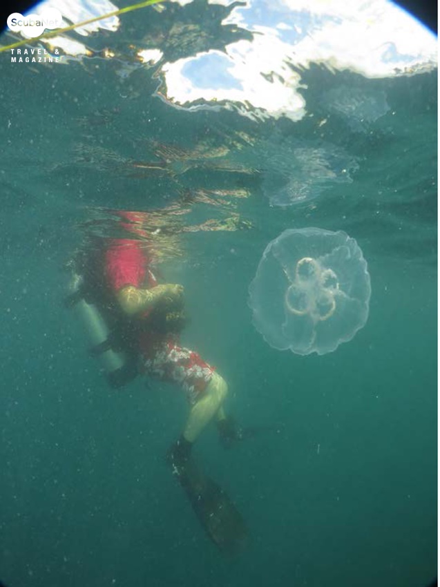 입수하여 수면 아래에 있는 보름달해파리와 다이버를 서둘러 촬영하느라 줌을 당겨 비네팅을없애지 못하였다. 동해 조도.