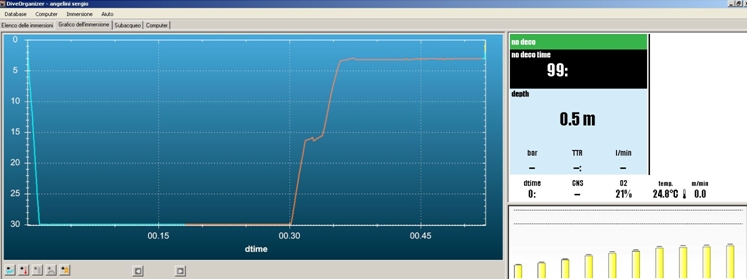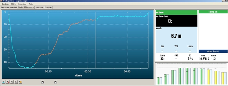 이러한 다이빙에서도 6m 수심의 강제 정지가 필요합니다. 그림에서 보듯이 수평선(130선) 위로 우측의 바들이 올라가 있습니다.