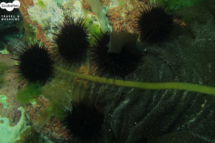 보라성게들이 미역에 달라붙어 포식하는 모습