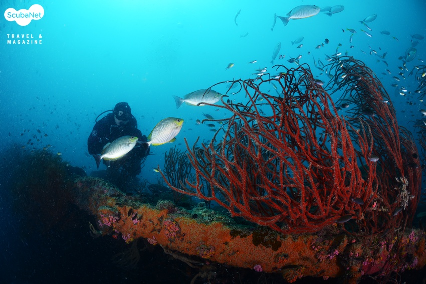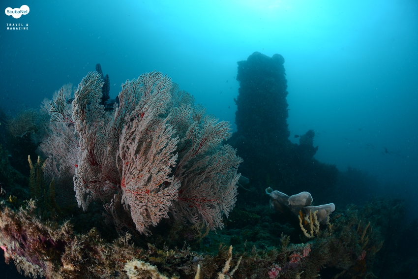 모라잔 마루의 선체에 부착한 고르고니안 산호와 레빗피쉬들. 모델/박건욱두 번째 다이빙으로 진행된 곳이었는데 길이 91.5m의 보조 수송선으로 최대 수심이 25m에 우현 쪽으로 뉘어져 있다. 선체의 상단이 12m 정도로 얕은 편이다. 선창을 통해 들어가니 꼬치고기 종류가 엄청나게 무리를 이루고 있었다. 2개의 커다란 보일러와 1960년대에 엔진을 인양해서 비어있는 엔진룸 등이 있었다.
