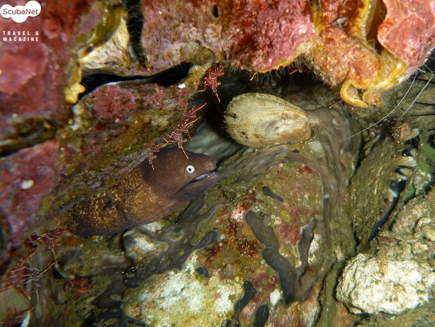 쓰리 아일렛의 곰치들.한곳에 1,2마리가 같이 들어가 있는 경우도 많았다