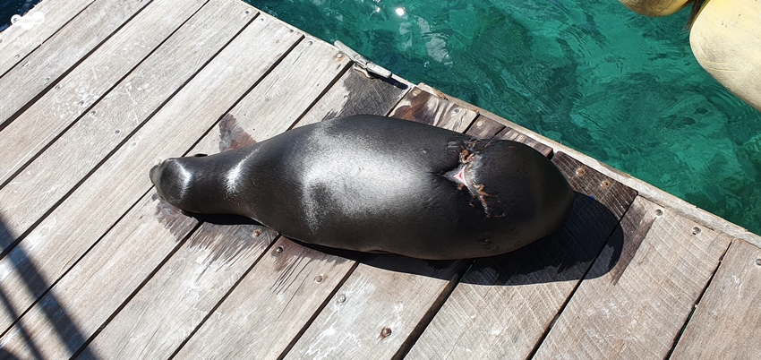 갈라파고스는 어딜 가든 선착장에서 바다사자들을 볼 수 있는데 돌아오는 길에 본 녀석은 엉덩이에 상어에게 물린