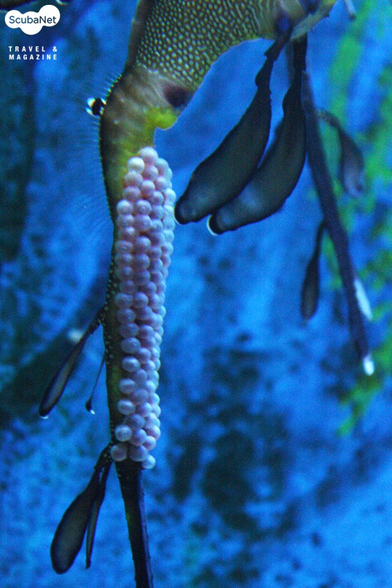 암컷의 산란 직후 꼬리에 알드릉ㄹ 붙이고 유영하는 위디 해룡수컷