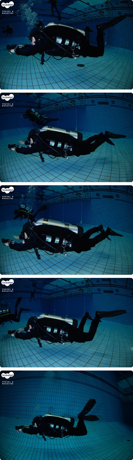●헬리콥터 킥(Helicopter Kick)좁은 공간에서 몸을 돌리기에 유용한 킥이다. 한쪽 다리는 프로그 킥을 하면서 다른 쪽 다리는 굽혀서 위를 향하도록 하고 핀은 수평으로 유지시킨다. 또는 한쪽은 프로그 킥을 하고, 다른 쪽은 백워드 킥을 동시에 한다. 마찬가지로 숙달을 위해서는 부단한 연습이 필요하다