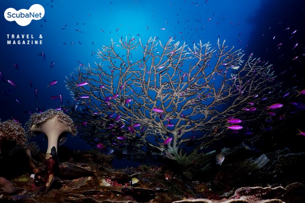 스쿨링이 형성된다. 얕은 수심에는 말미잘 군락 속의 아네모네 피시와 녹색의 산호와 안티아스 무리가 춤을 추고 있다.