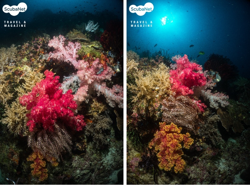 산호초의 연산호와 바다나리를 촬영하면서 다양한 각도로 촬영한 사진으로, 1번 사진은 물공간이 적으며 어둡게 표현되어 답답한 느낌이지만, 2번 사진은 물공간이 넉넉하며 물색이 표현이 풍부하여 피사체가 살아나는 사진이다. Balicasag, Bohol, Philippines. Sony RX100, Patima housing, Sea&Sea YS-D1 x2, M mode, AWB, f8, 1/1000s, ISO 100