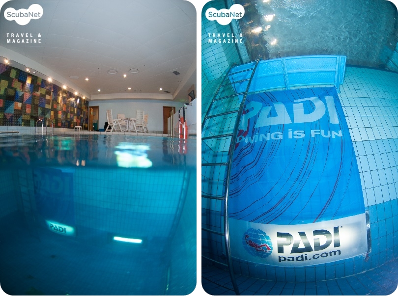 반수면으로 촬영 한 풀장의 모습과 바닥까지 연결 된 사다리와 대형 PADI 플래그