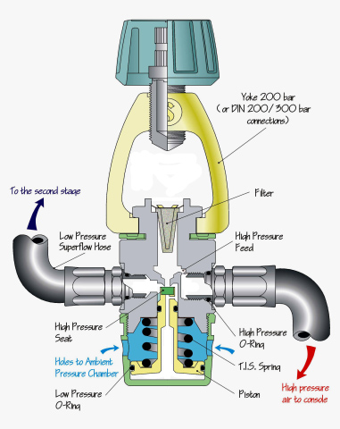 레귤레이터 1단계는 고압의 기체를 중간압력으로 낮추어주는 역할을 하는데, 다이버가 수중으로 다이빙을 하게 되면 중간압력에 수압이 가해지게 된다. 이 수압이 감지되는 부분이 다이아프램이라고 불리는 부품이면 다이아프램 타입, 피스톤이라고 불리는 부품이면 피스톤 타입이라고 불리게 된다.