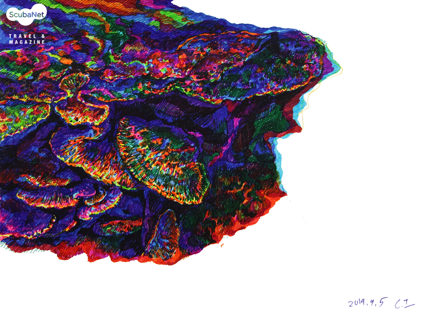 우선 나는 아닐라오 다이빙 포인트 중 제일 인상적이었던 네 곳(Cathedral, Kirby's rock, Layag Layag, Vistamar)을 골랐다. 그리고 각 장소의 특징을 가장 잘 담은 수중풍경사진을 몇 장 선정해 이를 16가지 색상의 펜으로 재현하기 시작했다.